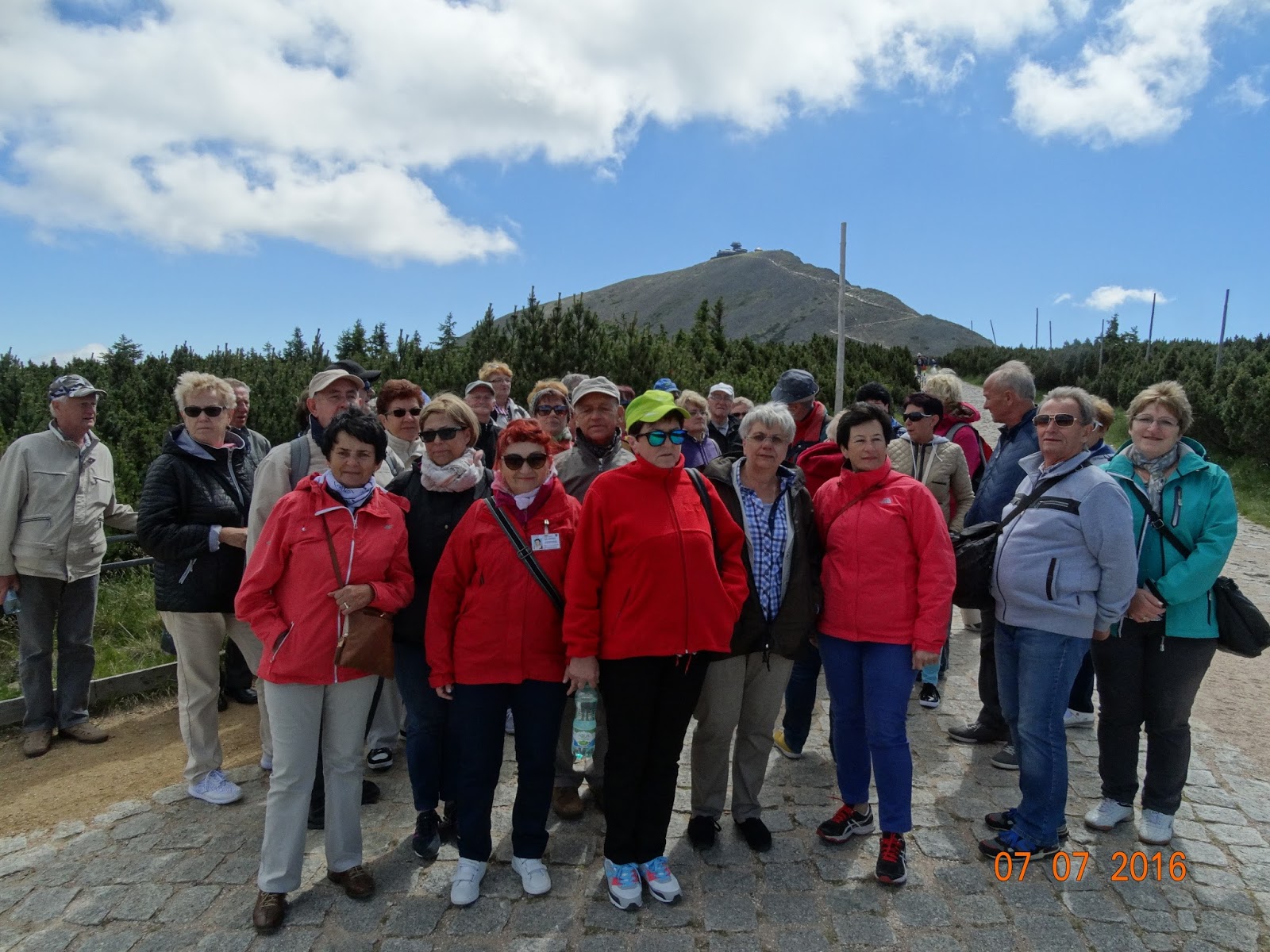 Przez cały dzień towarzyszył nam znakomity przewodnik Zygmunt Łupak. Podjechaliśmy autokarem pod wyciąg. Potem Miejską Kolej Linową na Kopę (szczyt wznosi się 1375 m n.p.m.) za 35 zł w obie strony (ponad 15 minut w każdą) w kierunku Śnieżki. Długość kolei to 2229 m, różnica wzniesień 530 m Stamtąd pieszo do Schroniska Górskiego „Dom Śląski” położonego na wysokości 1400 m n.p.m., gdzie zatrzymaliśmy się na regenerację. Widoczny w pobliżu szczyt Śnieżka, najwyższy w Karkonoszach, ma 1602 m wysokości.